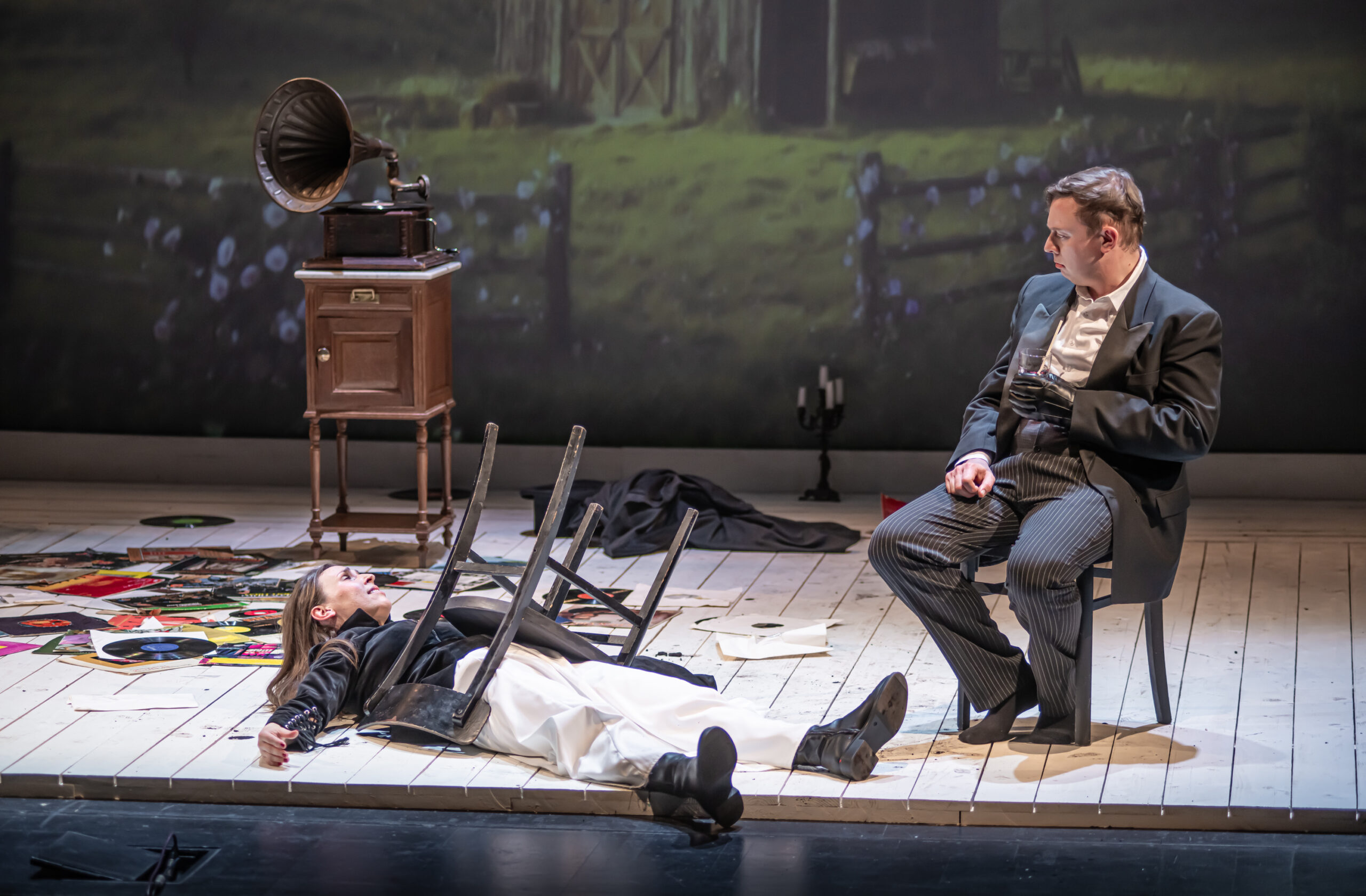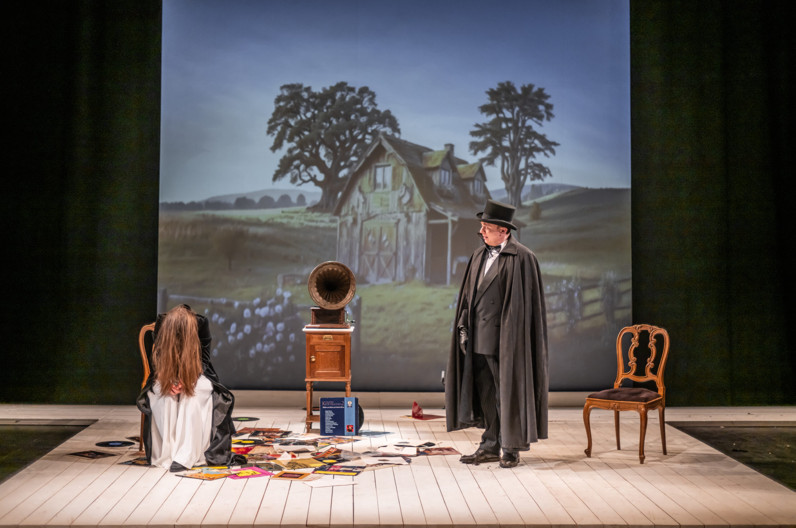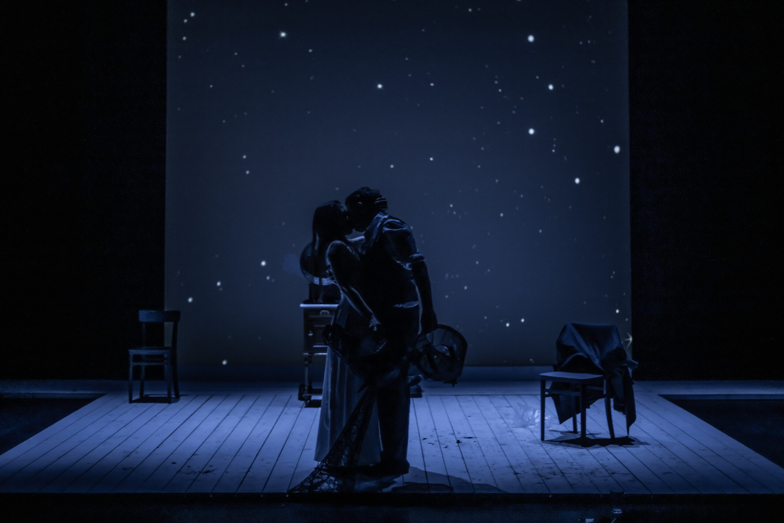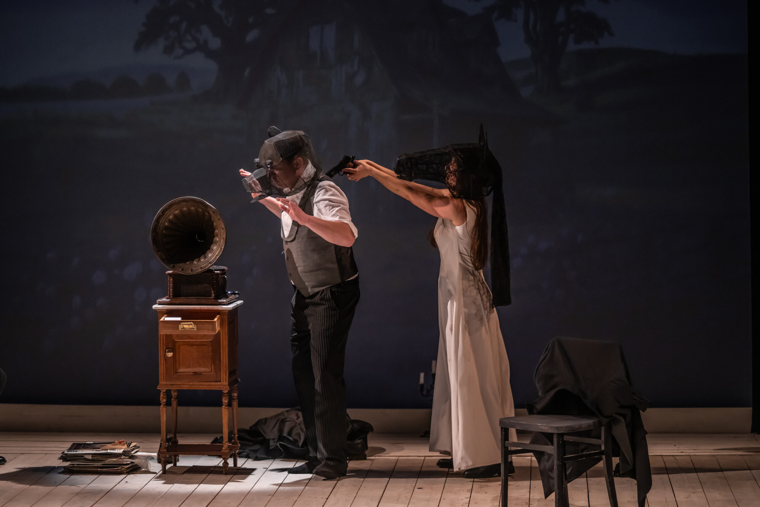 Po šestnajstih letih, kolikor nas loči od uprizoritve Treh sester, se na oder Gledališča Koper vrača dramatik Anton Pavlovič Čehov, tokrat z dvema enodejankama, ki ju je napisal po francoskem vzoru in ju zato poimenoval vodvilčka. V prvem z naslovom Medved (1888) prileteni posestnik Smirnov le dan pred rubežem posestva obišče mlado in lepo vdovo Jeleno Ivanovno Popovo, da bi od nje izterjal denar, ki ga je pred časom posodil njenemu pokojnemu možu, vendar ga v črnino zavita vdova odpravi z besedami, da ni razpoložena za ukvarjanje z denarnimi zadevami. Jezni in do nežnejšega spola nestrpni Smirnov se odloči, da bo pri vdovi vedril toliko časa, dokler ga ta ne izplača, ko pa ga Popova s pomočjo sluge poskuša vreči iz hiše, jo užaljen pozove na dvoboj. Popova, ki ni nikoli imela v rokah orožja, privoli, njena odločnost in pogum pa v ljubezni večkrat razočaranemu Smirnovu vzbudita simpatijo. Izpove ji ljubezen, Popova še nekaj časa hlini hladnost, nato pa … V drugem, Tragik po sili (1890), družinski oče in državni svetnik Tolkačov prosi prijatelja Muraškina, naj mu posodi revolver, saj je življenje v službi in doma, kjer mora vsakodnevno izpolnjevati prošnje družinskih članov, postalo prenaporno. Muraškin najprej sočustvuje z njim, nato pa ga prosi, naj na poti domov skupni znanki odnese še neko malenkost. Ko Tolkačov sliši še njegovo prošnjo, ga popade bes in zahteva, naj teče kri …